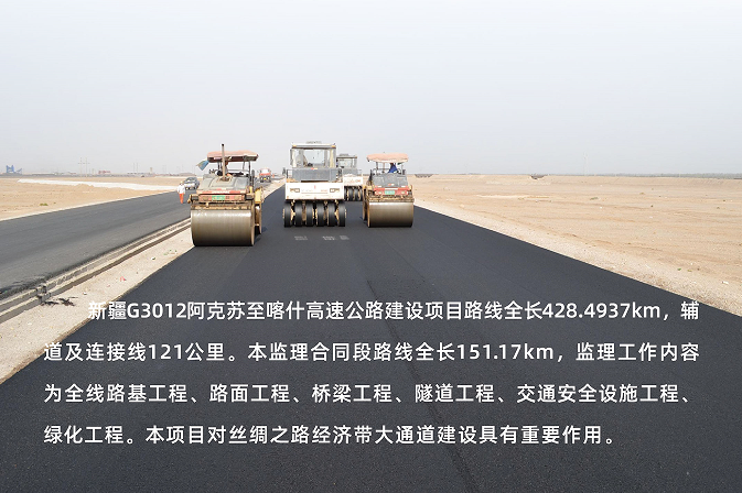 新疆G3012阿克苏至喀什高速公路建设项目路线全长428.4937km,辅道及连接线121公里。本监理合同段路线全长151.17km,监理工作内容为全线路基工程、路面工程、桥梁工程、隧道工程、交通安全设施工程、绿化工程。本项目对丝绸之路经济带大通道建设具有重要作用。荣获2016~2017年度公路交通优质工程奖-李春奖