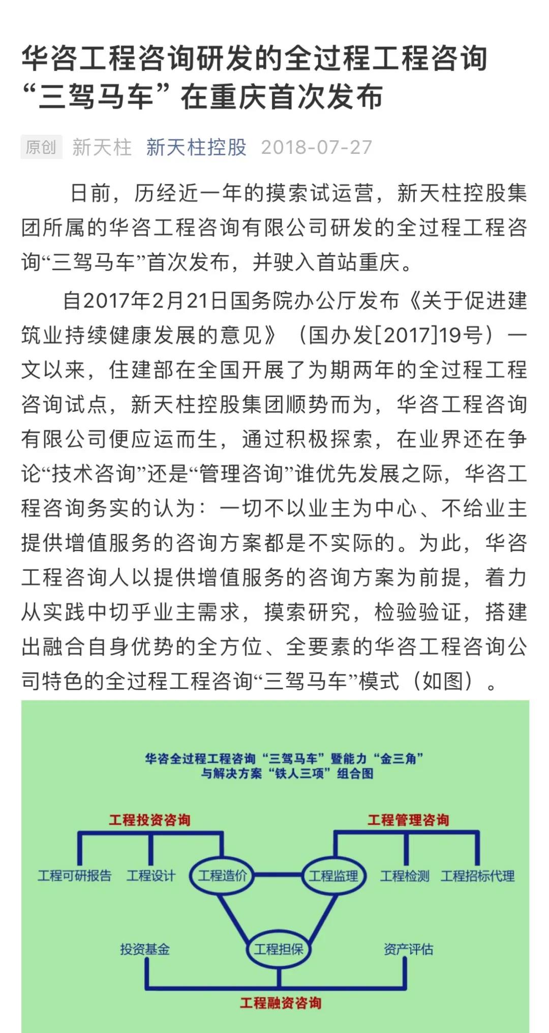 2017年2月21日国务院办公厅发布《关于促进建筑业持续健康发展的意见》(国办发[2017]19号)一文以来,合肥监理公司借住建部在全国开展全过程工程咨询试点之际,积极实践,2018年搭建了“华咨咨询”为品牌的全过程工程咨询“三驾马车、金三角、铁人三项”(如下图)。